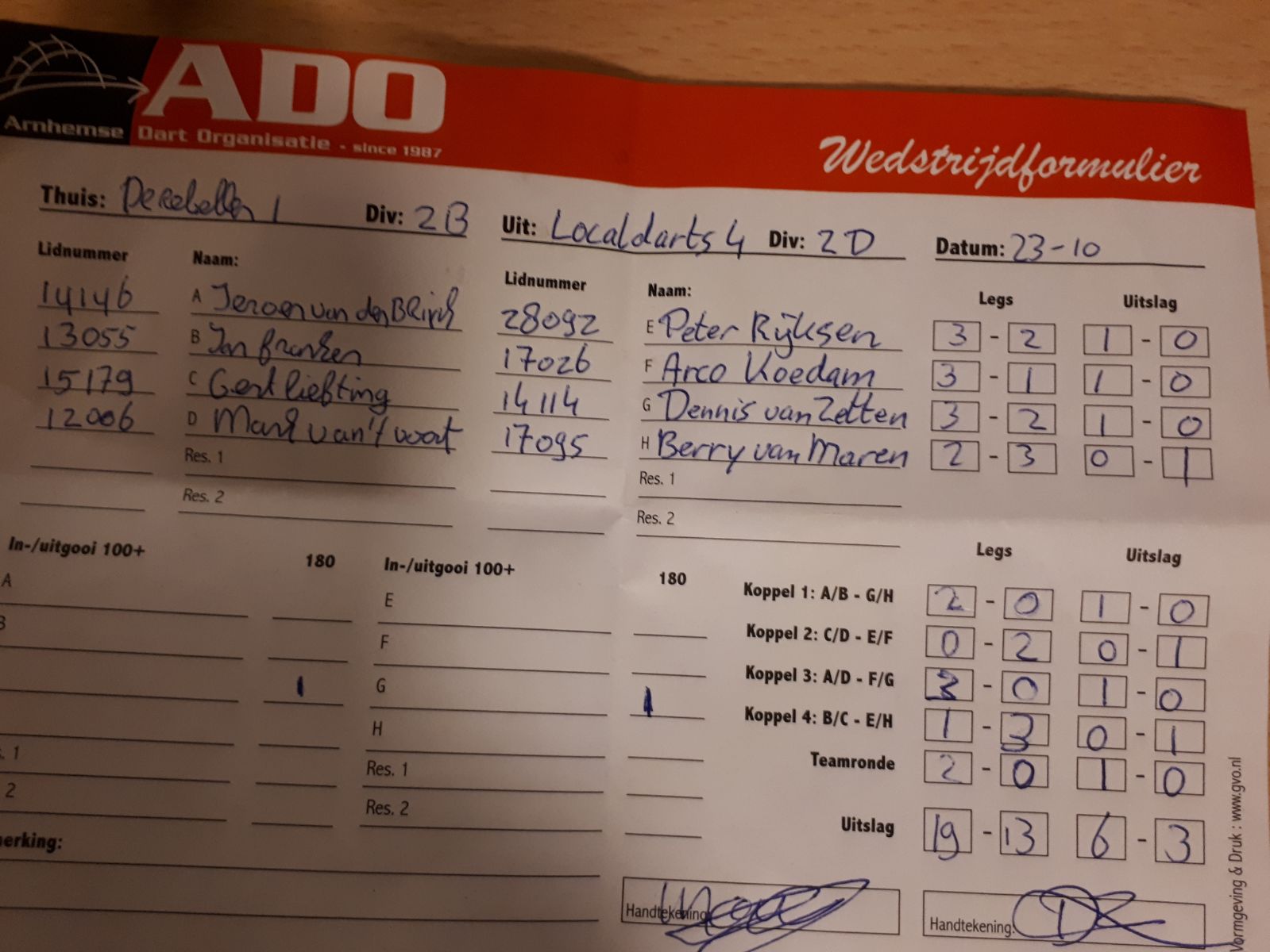 De 2de en tevens laatste poulewedstrijd van Localdarts 4 moest tegen de Rebellen 1 in Barneveld gegooid worden. Door afwezigheid van Dennis Kraak en Angelo Timmer, stonden Peter Rijksen, Arco Koedam, Dennis van Zetten en Berry van Maren deze week aan de oche. Na een stroef begin van de singles, wist alleen Berry zijn wedstrijd te winnen. Hierdoor keek team 4 na de singles tegen een 3-1 achterstand aan.